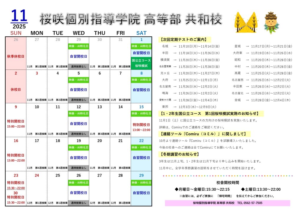 【共和校】11月のカレンダーになります。ぜひご確認ください。